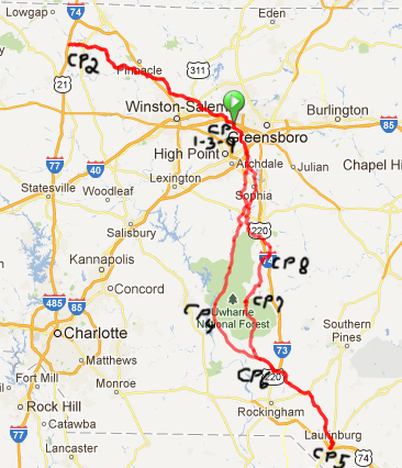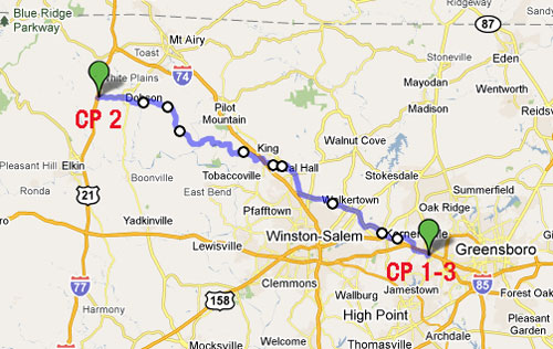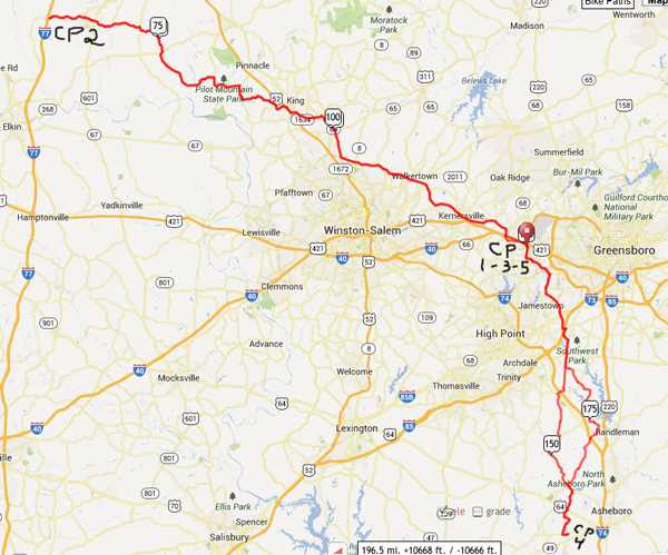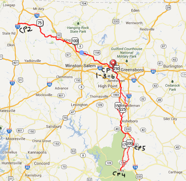 Riders must follow and complete the approved route. This route goes through several small towns in central North Carolina traveling along mostly low traffic roads. There may be some sections where traffic is high, so please ride carefully and safely at all times. The intermediate controls are where stores allow you to refuel with some basic supplies. There are also some other stores along the route where you may be able to stop and get limited nutritional supplies.