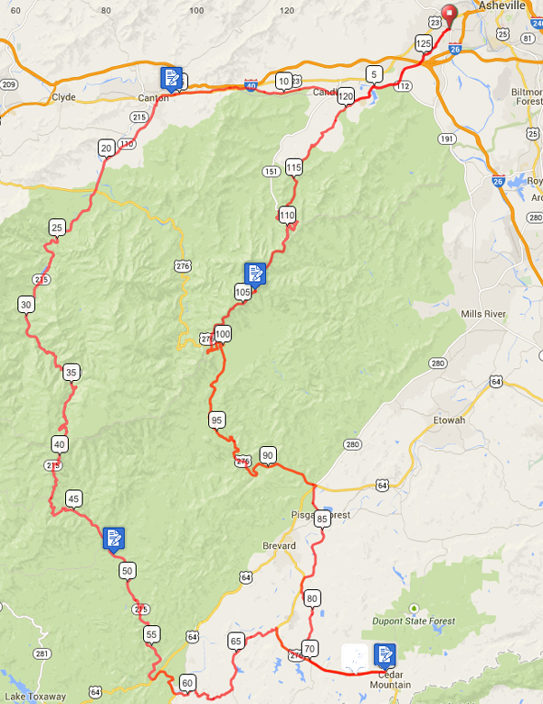 There is no official SAG on any of these Brevets. Asheville NCCurrently the Brevet is planned to be started in the Ingles Grocery parking lot, 697 Haywood Rd. The finish will be 1 block away at Standard Pizza, 631 Haywood Rd, Asheville NC Some of you may want to sign up for the NCRandonCyclists Yahoo list http://groups.yahoo.com/group/ncrandoncyclists/join The routes are such that most reasonably fit randonneurs should be able to finish them within the RUSA time limits. If your fitness is low or your stop times are long then time could be tight. Some of you may need a triple or low gear compact crank, but most riders should not need extra low gearing. You will need to watch your stop times and site seeing times, so consider planning to keep a steady effort. Please save some energy for the few hills and long rollers. Drop Bags & SagThere is no drop bag service |