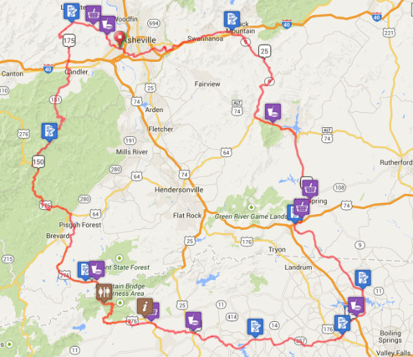 There is no official SAG on any of these Brevets. Asheville NCCurrently the Brevet is planned to be started in the Ingles Grocery parking lot, 697 Haywood Rd. The finish will be 0.2 miles away at Westville Pub, 777 Haywood Rd, Asheville NC Some of you may want to sign up for the NCRandonCyclists Yahoo list http://groups.yahoo.com/group/ncrandoncyclists/join The routes are such that most reasonably fit randonneurs should be able to finish them within the RUSA time limits. If your fitness is low or your stop times are long then time could be tight. Some of you may need a triple or low gear compact crank, but most riders should not need extra low gearing. You will need to watch your stop times and site seeing times, so consider planning to keep a steady effort. Please save some energy for the few hills and long rollers. Drop Bags & SagThere is no drop bag service |