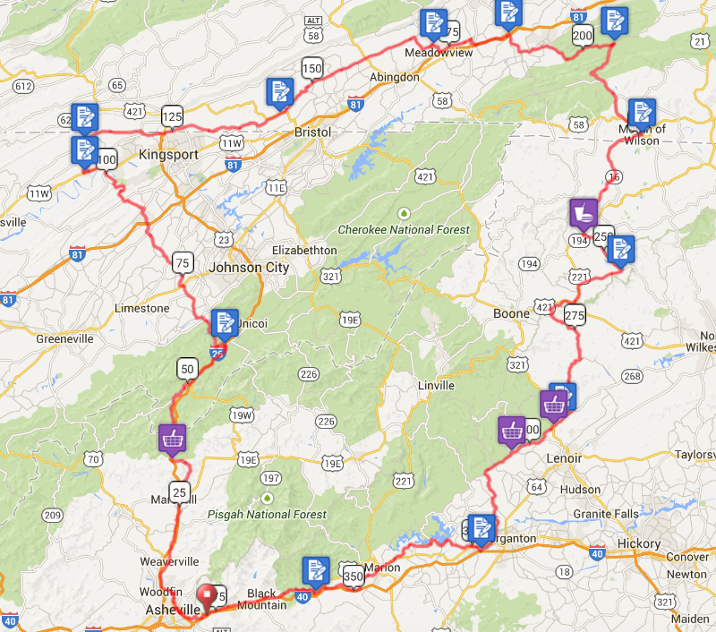 There is no official SAG on any of these Brevets. Asheville NCThe Brevet is planned to start at Drop Bags & SagThe drop bags will be taken to the official overnight hotel for you and picked up to bring back to the finish sometime Sunday. For those that are doing the 600k a small individual drop bag may be used and taken to official overnight hotel in West Jefferson, detail will be posted soon. Only one location may be used for an individuals drop bag. Please do not put anything in your drop bag that you cannot do without for a few days just in case we miss you or don't get them to you at the finish for some reason. If you do not wait at the finish for your drop bags, they can be shipped to you at your expense, BFL will not pay for shipping of items to you. We will not be responsible for your drop bags or items in your drop bags.There is no official SAG on any of these Brevets. Some of you may want to sign up for the NCRandonCyclists Yahoo list http://groups.yahoo.com/group/ncrandoncyclists/join The routes are such that most reasonably fit randonneurs should be able to finish them within the RUSA time limits. If your fitness is low or your stop times are long then time could be tight. Some of you may need a triple or low gear compact crank, but most riders should not need extra low gearing. You will need to watch your stop times and site seeing times, so consider planning to keep a steady effort. |