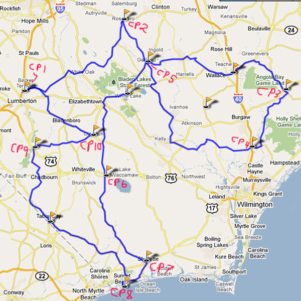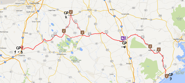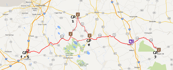 Riders must follow and complete the approved route. This route goes through several small towns in central North Carolina traveling along mostly low traffic roads. There may be some sections where traffic is high, so please ride carefully and safely at all times. The intermediate controls are where stores allow you to refuel with some basic supplies. There are also some other stores along the route where you may be able to stop and get limited nutritional supplies.