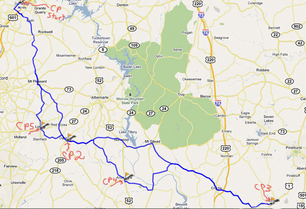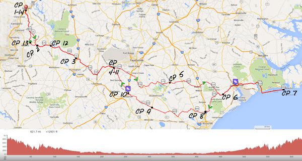 This is an ACP Brevet. The total time allowed from start to finish is 13.5 hours for the 200k and 20 hours for the 300k and 27 hours for the 400k. and 40 hours for the 600k and 75 hours for the 1000k. Riders must follow and complete the approved route. This route goes through several small towns in central North Carolina traveling along mostly low traffic roads. There may be some sections where traffic is high, so please ride carefully and safely at all times. The intermediate controls are where stores allow you to refuel with some basic supplies. There are also some other stores along the route where you may be able to stop and get limited nutritional supplies.