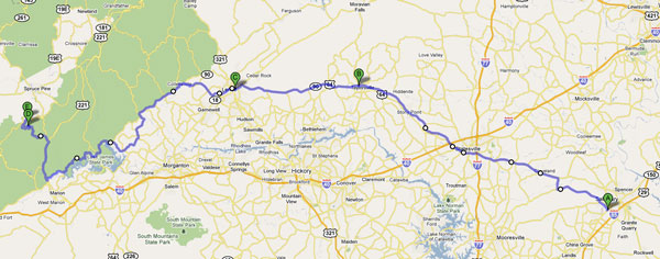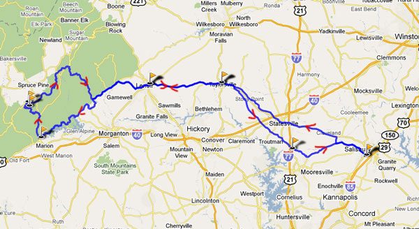 This is an ACP-RUSA Brevet route number 698. The total time allowed from start to finish is 13.5 hours. The actual distance is approximately 206 Kilometers. Riders must follow and complete the approved route. This route goes through several small towns in central North Carolina traveling along mostly low traffic roads. There may be some sections where traffic is high, so please ride carefully and safely at all times. The intermediate controls are at the Charles, N. Wilkesboro & Charles where stores allow you to refuel with some basic supplies. There are also some other stores along the route where you may be able to stop and get limited nutritional supplies.