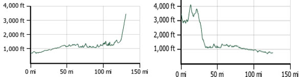 The route is somewhat of a challenging route in places due to the terrain, but not such that most reasonably fit randonneurs would not be able to finish on time. Some of you may need a triple or low gear compact. You will need to watch your stop times and site seeing times, so consider planning to keep a steady effort on the easier section which you have a good bit of in the first 100 miles and there are quite a few long down hills too. Please save some energy for the middle section and the last section of long rollers.